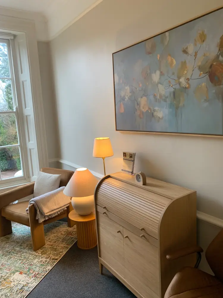 The room is private, calm and thoughtfully arranged to provide a safe and containing space for therapy.